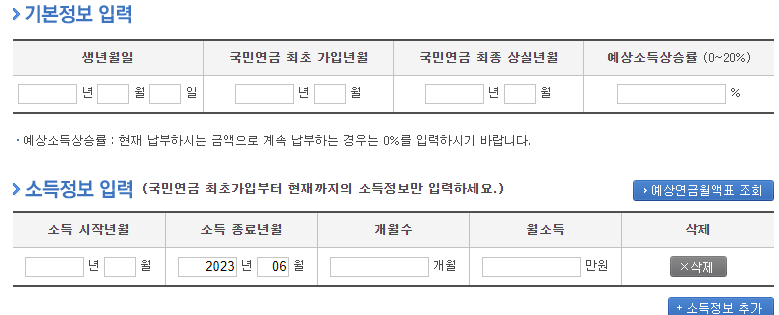 아래의 페이지에서 기본정보, 소득정보, 크레디트 대상을 입력하고 나면 연금 계산을 할 수 있습니다.