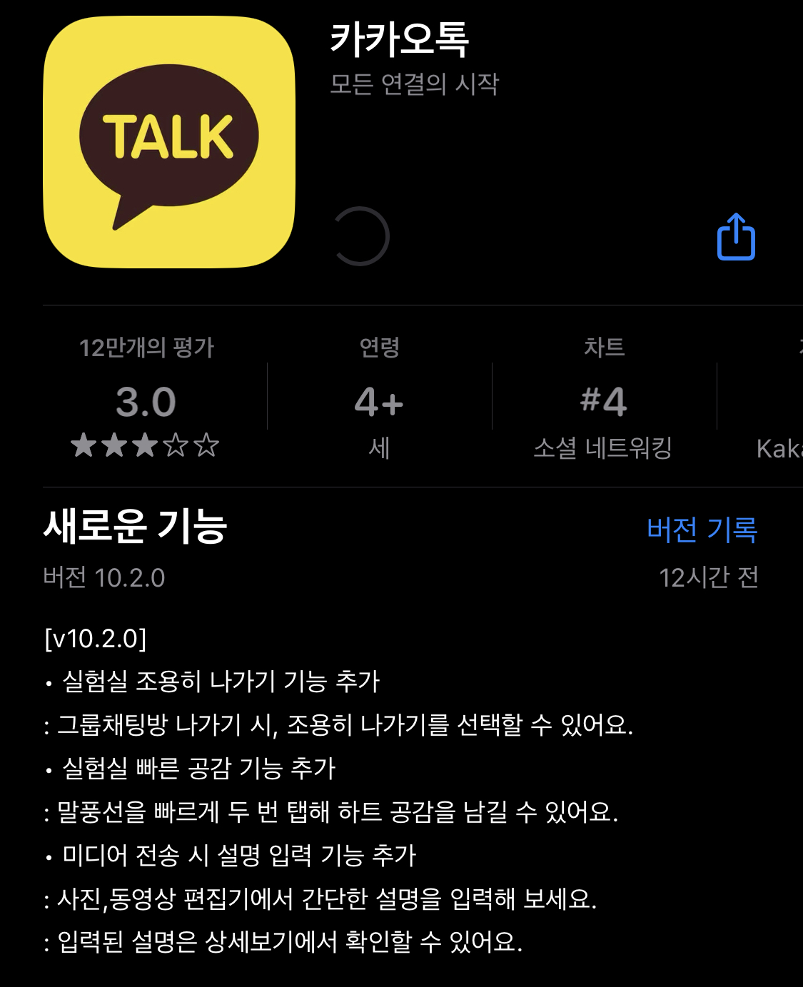 조용히 나가기 기능을 이용하기 위해서는 아래의 사진과 같이 버전 10.2.0의 카카오톡이 필요합니다. 카카오톡 업데이트는 아래에서 편하고 쉽게 진행할 수 있습니다.