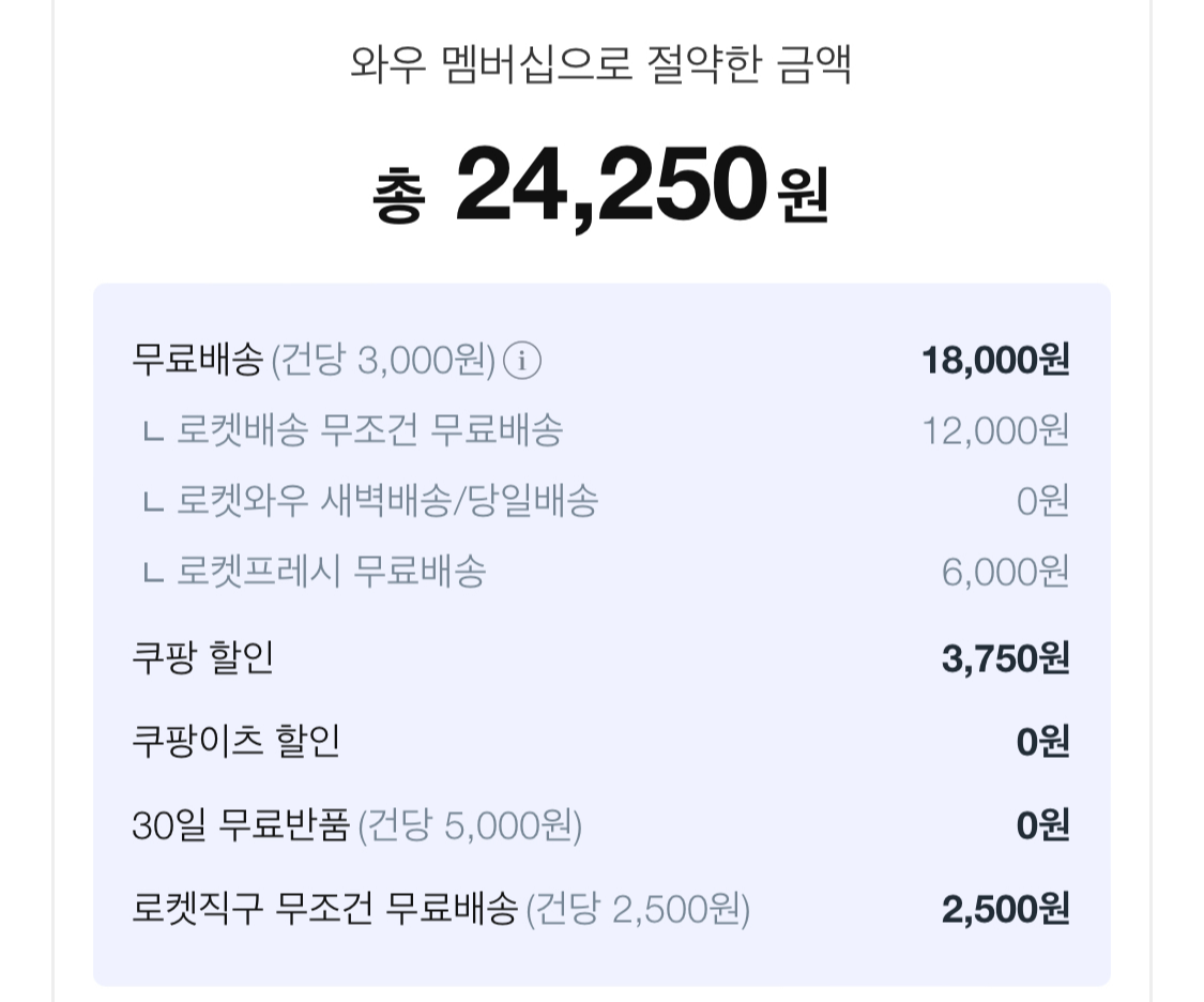 쿠팡 로켓배송 상품은 주문하면 다음 날 받아볼 수 있는 상품인데요, 멤버십 가입을 하지 않을 경우 19,800원 이상 제품을 주문해야 배송비가 들지 않습니다. 하지만 와우 멤버십 가입을 하고 나면 1,000원짜리 한 개를 사도 무료배송을 해줍니다.로켓프레시 상품 새벽 배송